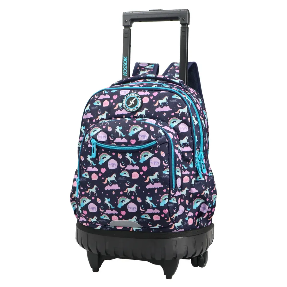 ¡Prepárate para la diversión escolar con nuestra mochila con carro! Es perfecta para llevar sus libros y cosas de manera fácil y cómoda. Tiene un compartimento grande para guardar libros y cuadernos, además de un bolsillo más pequeño para cosas pequeñas y otro en frente. También cuenta con bolsillos a los lados y asas acolchadas para que los niños puedan llevarla de manera sencilla. Para mayor seguridad, tiene detalles reflectantes, y está hecha para durar con costuras fuertes y cierres resistentes. ¡Una opción práctica y divertida para acompañar a los niños en la escuela!