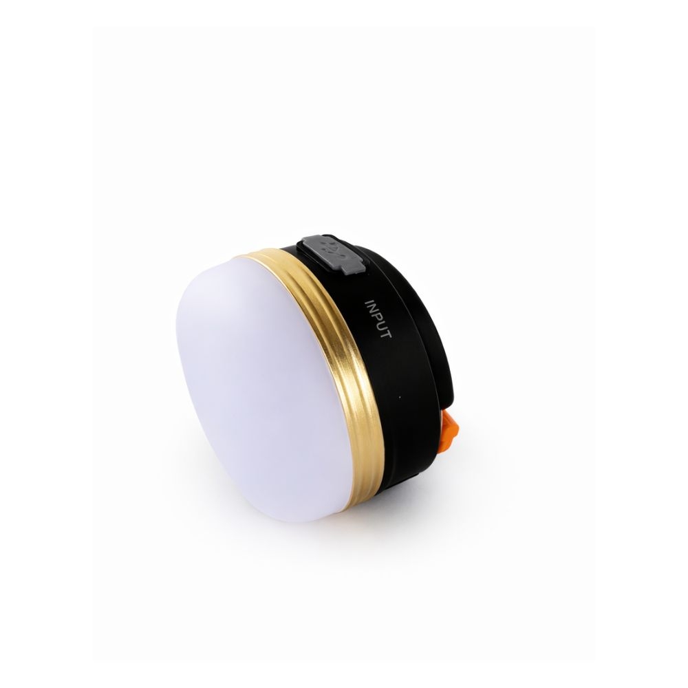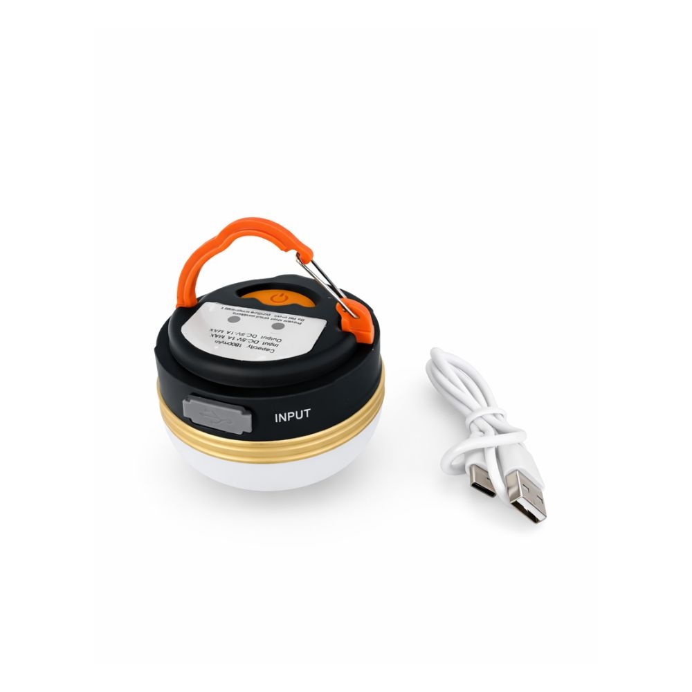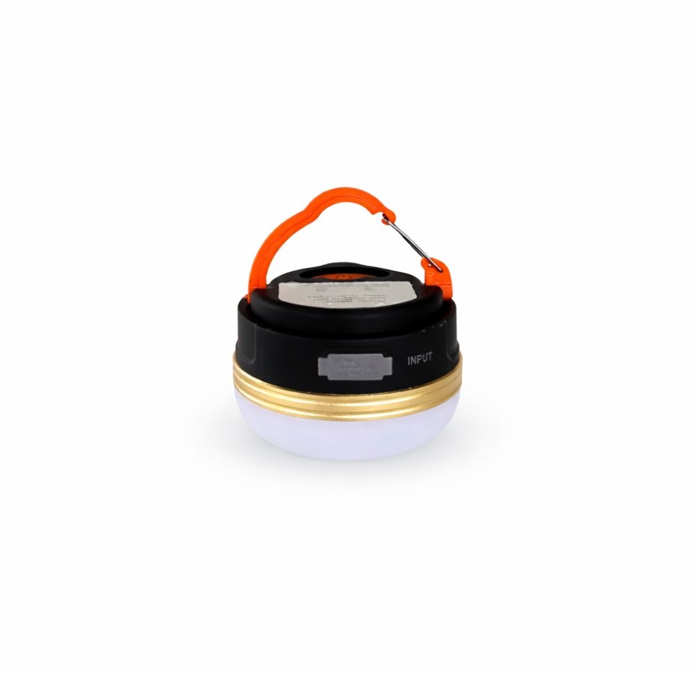 Lámpara portátil para camping con luz LED y puerto USB, ideal para emergencias o uso al aire libre, diseño compacto y fácil de transportar.