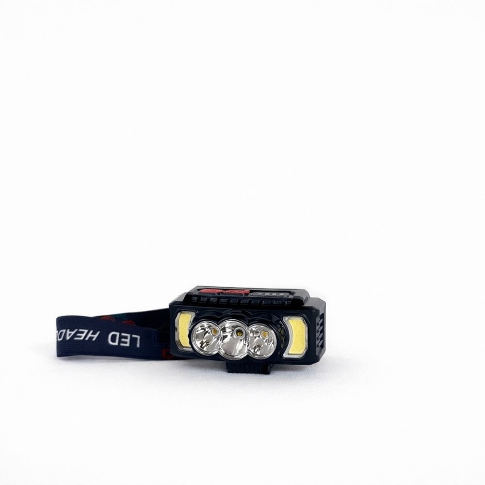 Linterna frontal LED recargable por USB con múltiples luces y banda ajustable, cómoda y potente, ideal para camping, trabajo o actividades al aire libre.