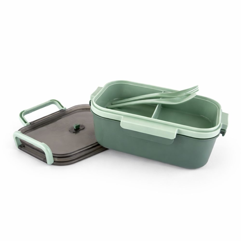 Lunch box con compartimentos y cubiertos, práctica y resistente, ideal para llevar comida al trabajo, escuela o actividades al aire libre.