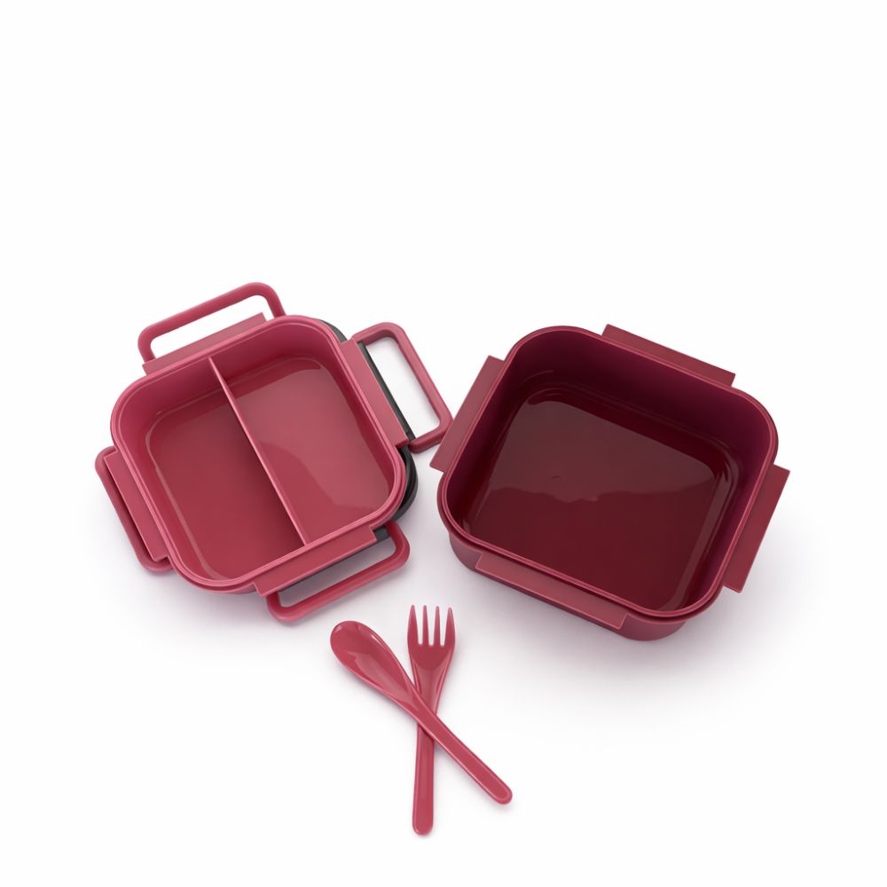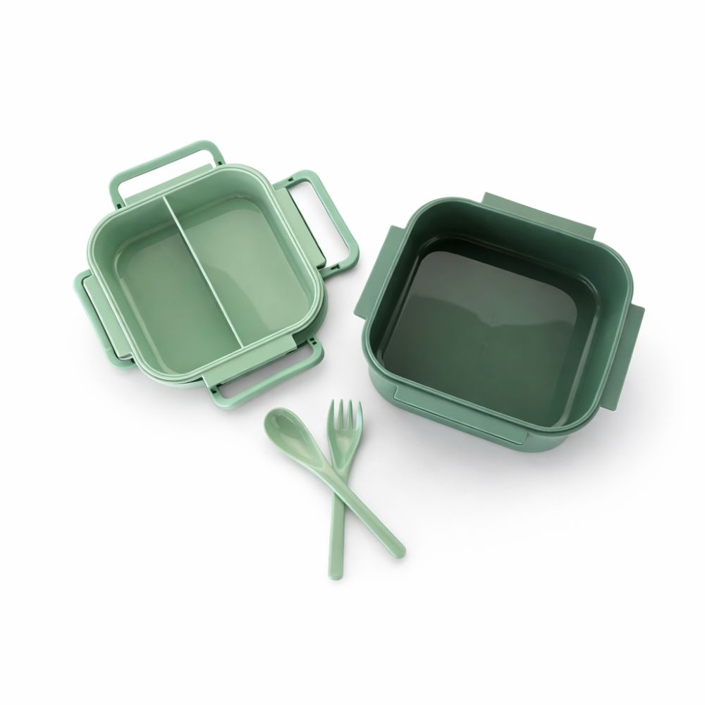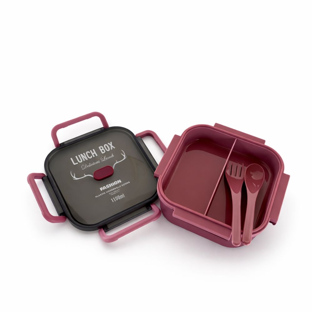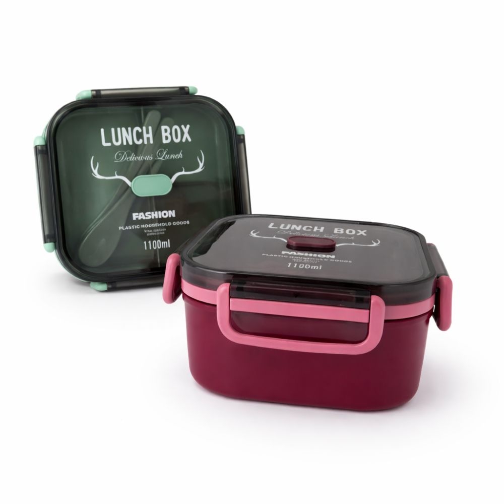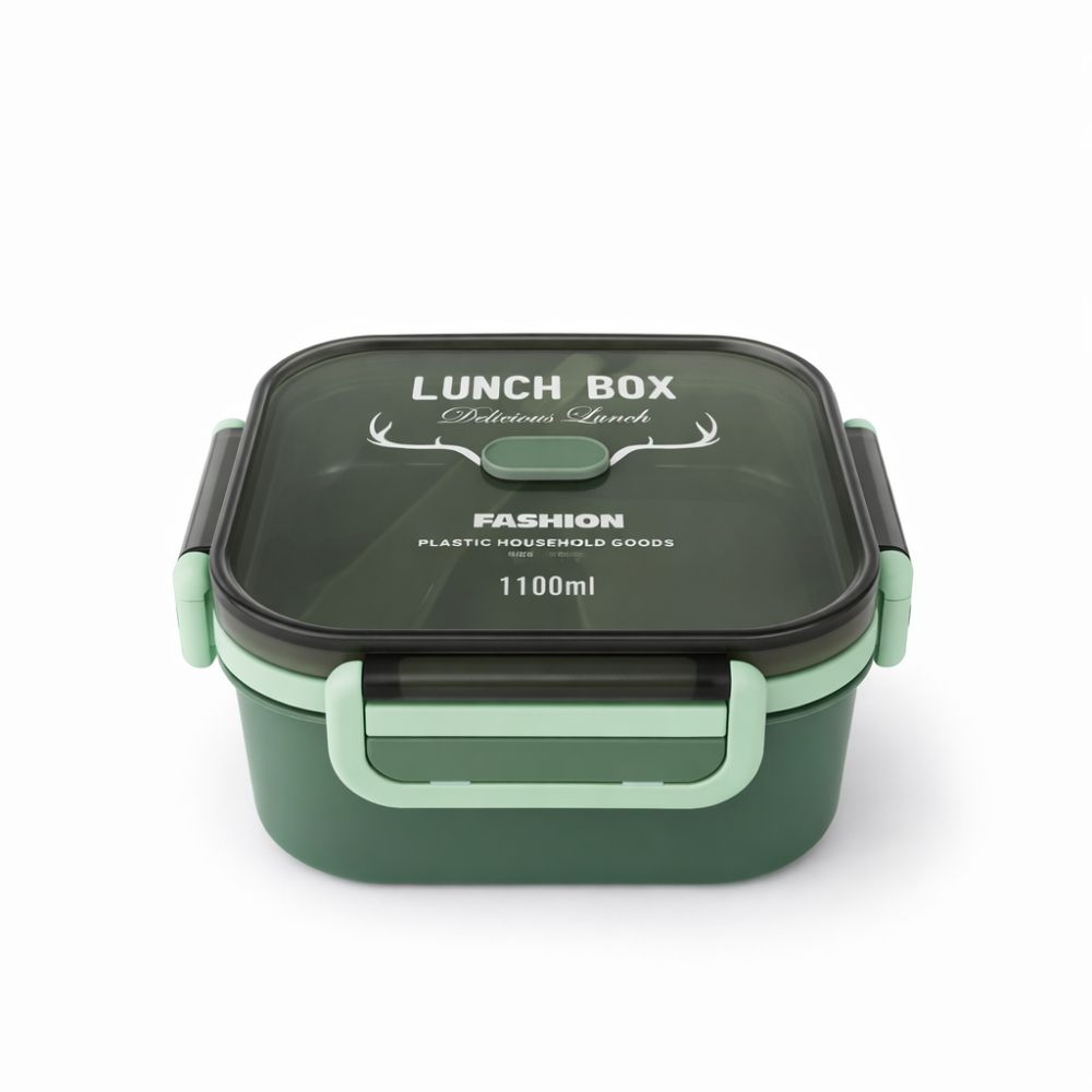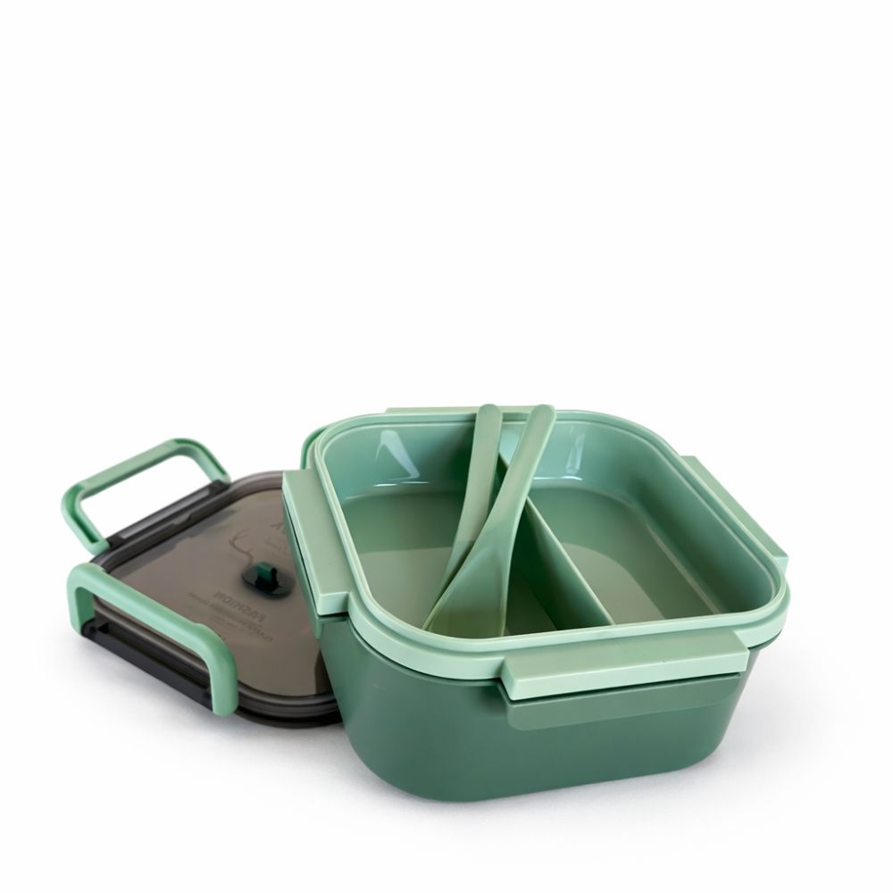 Lunch box con compartimentos y cubiertos, práctica y resistente, ideal para llevar comidas al trabajo, escuela o actividades al aire libre.